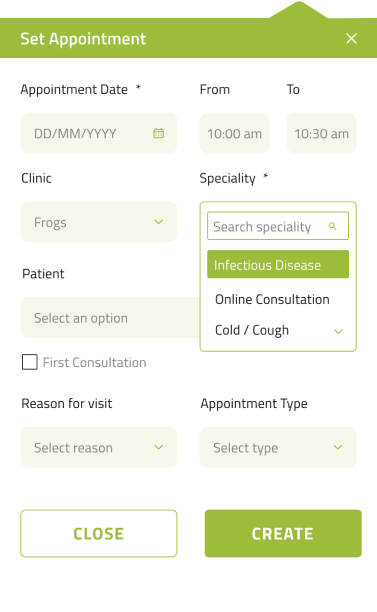 Choose the types of medical appointments available for a given slot of time: in person, video or home visit, as well as the corresponding medical speciality